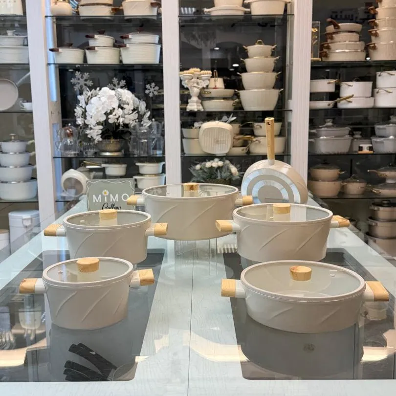 دسته‌های این سرویس از جنس باکالیت ترک باکیفیت ساخته شده‌اند که در برابر حرارت مقاوم هستند و داغ نمی‌شوند. این ویژگی هنگام جابجایی قابلمه‌ها اهمیت زیادی دارد و ایمنی کار را افزایش می‌دهد. طراحی ارگونومیک دسته‌ها نیز باعث می‌شود در دست گرفتن ظروف راحت باشد و کنترل بهتری هنگام آشپزی داشته باشید.