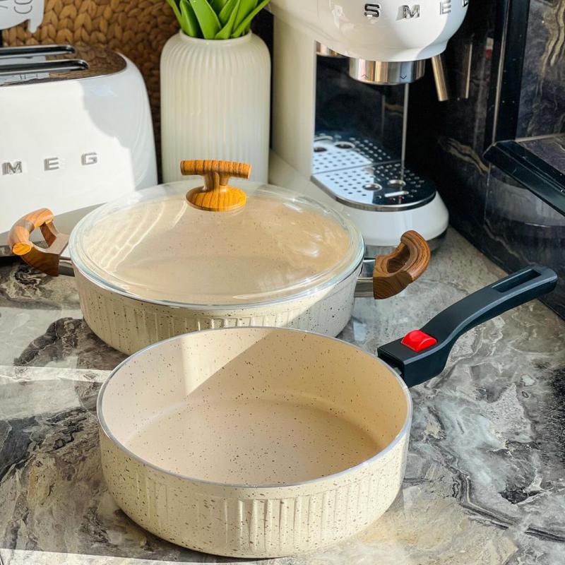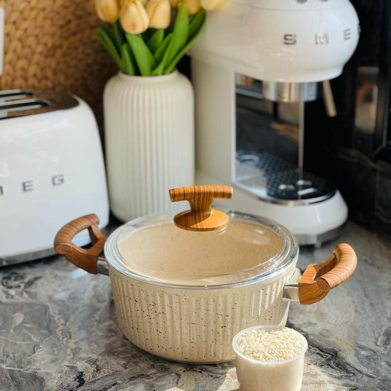•  دسته‌ها: ساخته شده از باکالیت ترک با طرح چوب که مقاومت بالا در برابر حرارت دارد، برای اطمینان از ایمنی و راحتی در هنگام آشپزی.