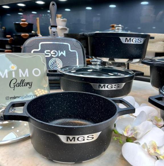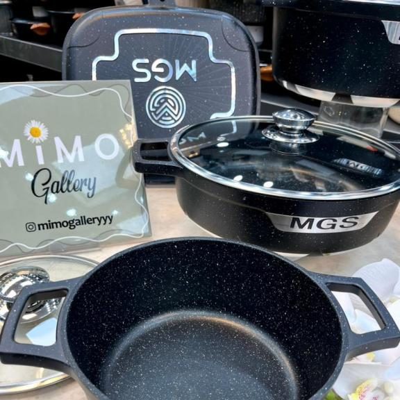 4 قابلمه در سایزهای 20-24-28-32 تابه گرد دربدار سایز 28 تابه دوطرفه رژیمی سایز 32 دو عدد دستگیره سلیکونی یک عدد پیشبند |