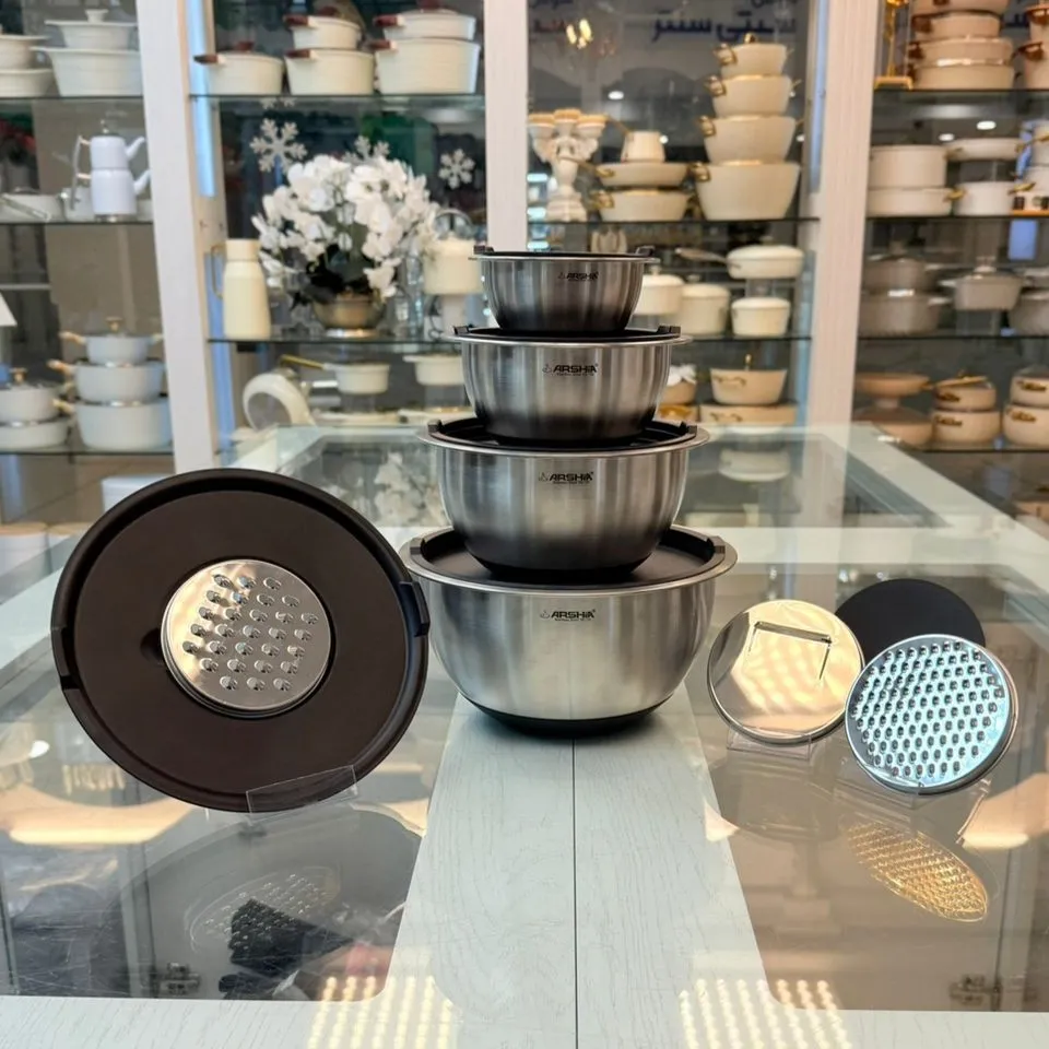 ست چندکاره با کیفیت بالا برای مخلوط کردن و نگهداری غذا ، درب ها هوابند داشته باشند و ته ظروف ضد لغزش ، برای آشپزی ، مخلوط کردن ، سرو غذا،نگهداری غذا ، دارای طراحی تودر تو موجت صرفه جویی در فضای کابینت میشود ، جایگزین سالم برای ظروف پلاستیکی |